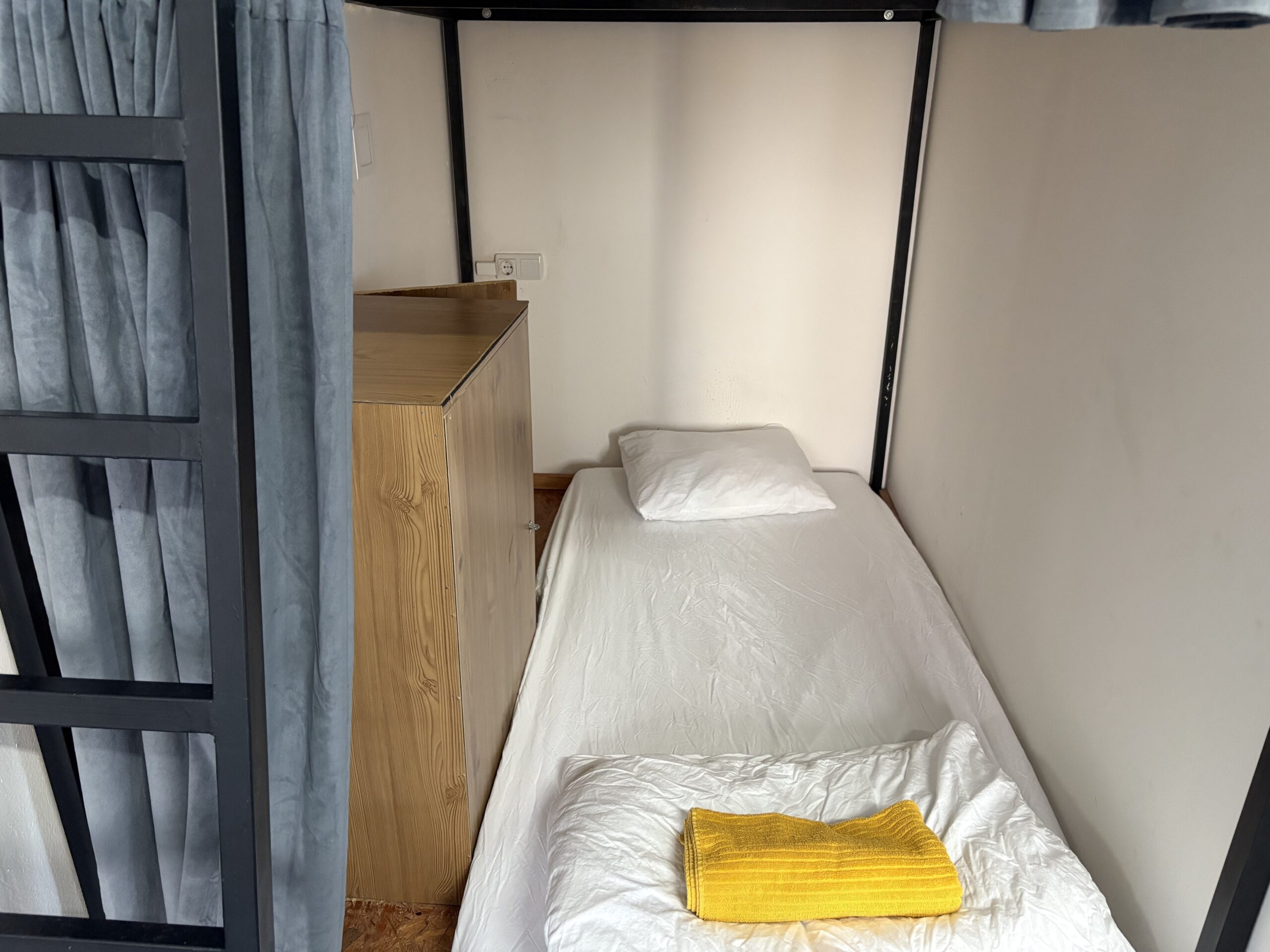 Una habitación silenciosa , una litera muy acogedora yo escogí baja , colchón bueno y limpieza excelente. De los hostel mas tranquilos,